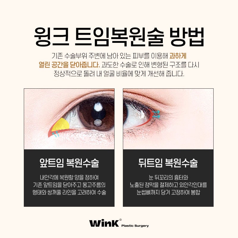 개구부가 원하는 것보다 너무 작거나, 눈 앞부분의 모양이 원하는 모양이 아니거나, 개구 과정으로 인해 흉터가 생긴 경우에도 리페어를 통해 원하는 눈 모양을 복원할 수 있습니다.