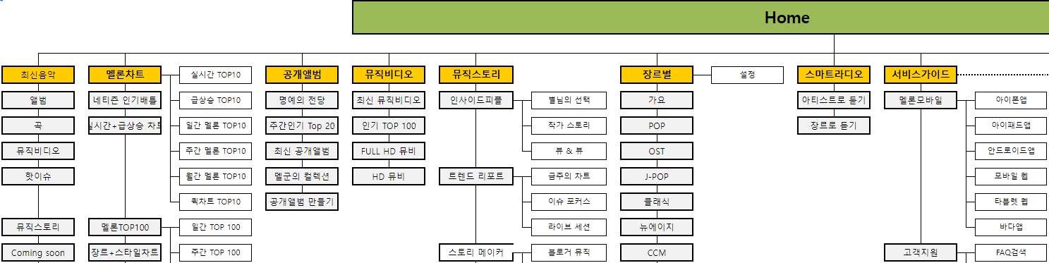 페이지에 구성된 메뉴와 서비스를 구조를 쉽게 이해할 수 있도록 시각화한 문서입니다. 예) GNB가 열렸을 때 사이트맵에 표시되는 화면