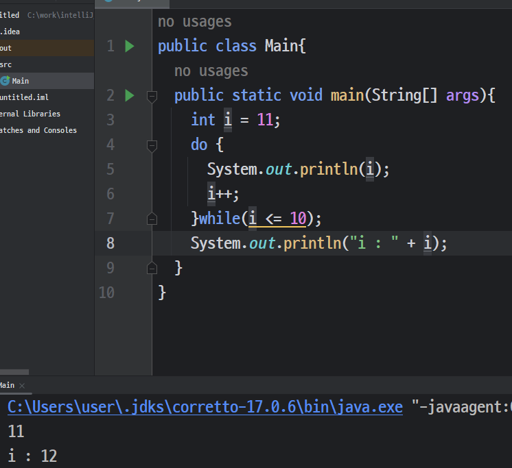 위의 코드가 일반적으로 사용되는 while문이라면 do while문은