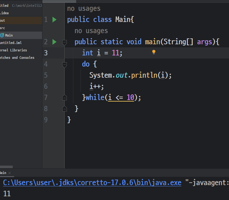 11번만 한번 실행되고 그 이후에는 while 문의 조건식과 일치하지 않는 false이므로 실행되지 않는다.