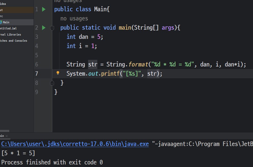 위의 코드가 있다고 가정하고 실행하면 5 * 1 = 5라는 결과 값이 출력됩니다.