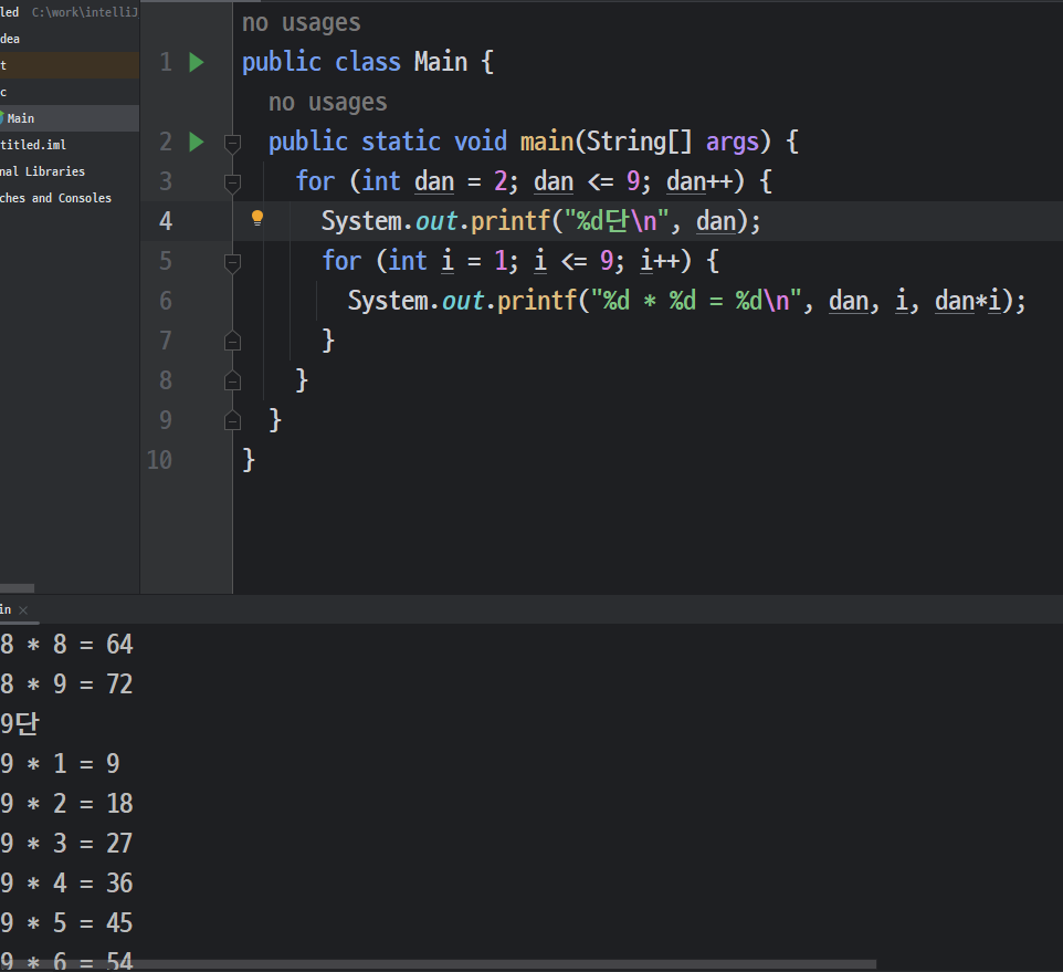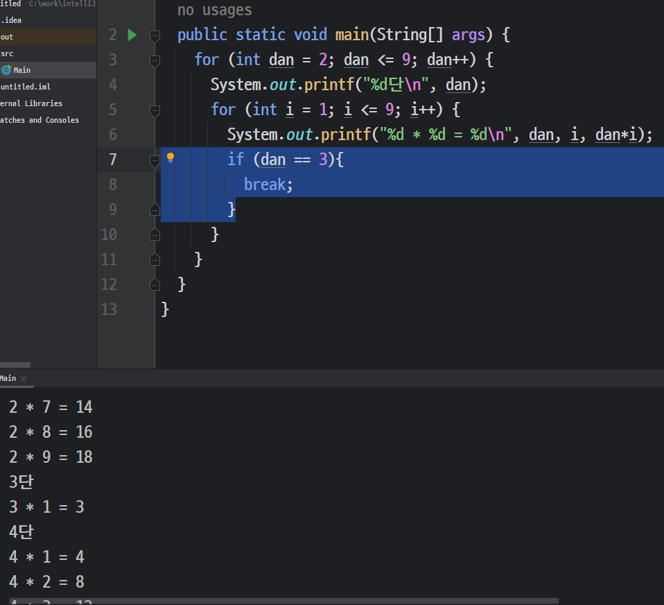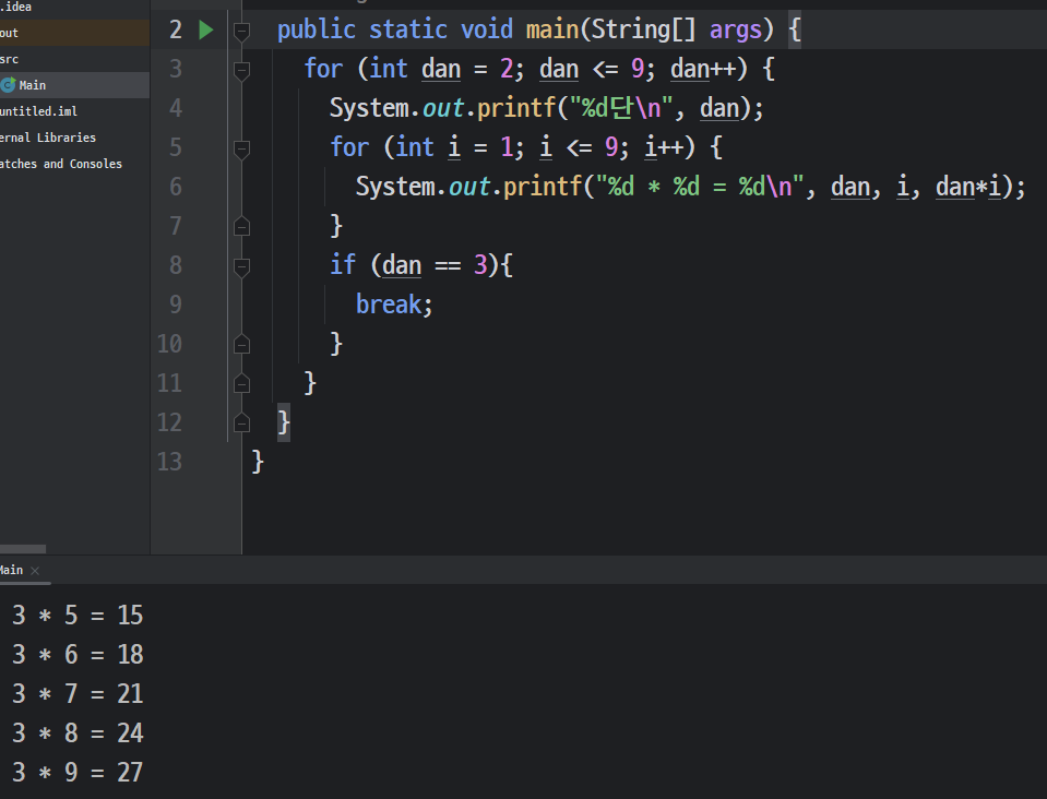 dan-for 문(outer) 대신 i-for 문(inner)에 if 문을 넣으면 dan이 3이 되었을 때, 즉 3 * 1 = 3이 실행될 때 해당 위치에서 빠져나와 리턴한다. 외부로. 측면 반복문이 실행됩니다.